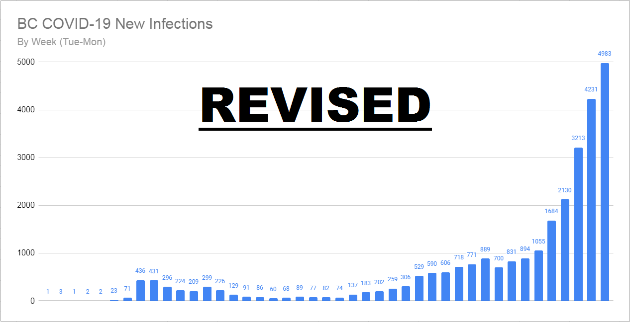 Revised: Weekly New Infections Charts Today in an unusual Wednesday public briefing, Dr. Bonnie Henry informed the province that due to a glitch, the number of new infections from the Fraser Health Authority had been reported incorrectly, and just over 1 week’s worth of data had to be corrected. As such, we have updated theContinue reading “COVID-19 Diary – Day 258”