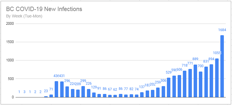 Weekly Chart Update The numbers are in for the 7 day period of October 20-26 and they are not good. During the previous week, BC’s record for the most reported cases in a single day was broken 3 times, with our current record sitting at 317 (October 24th’s number). Additionally, the record has now beenContinue reading “COVID-19 Diary – Day 228”