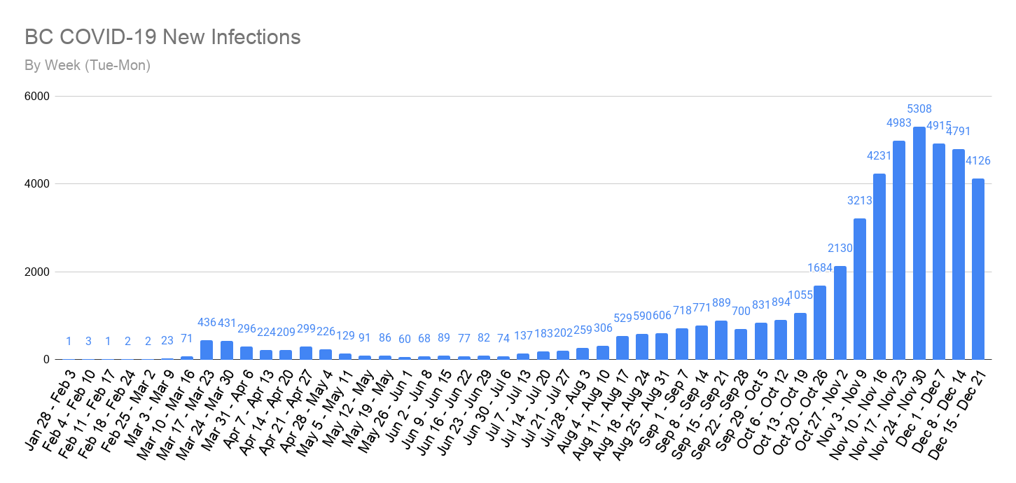 Weekly New Infections Charts Every Monday we take a look at our week to week totals and chart how BC’s fight against COVID-19 is progressing. Because of the reporting schedule used in BC, we use 7-day totals running from Tuesday to Monday. The above chart shows each week of the pandemic as a unique bar.Continue reading “COVID-19 Diary – Day 270”